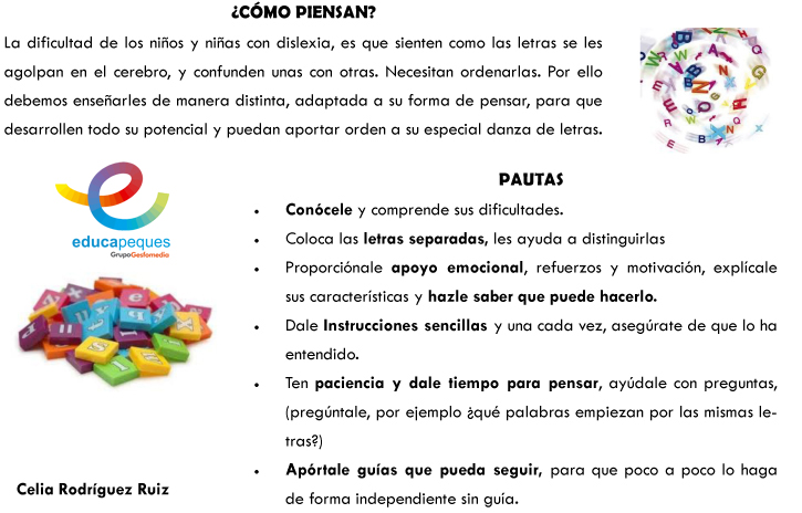 - Las letras y yo. Libro interactivo que cuenta la historia de una niña con dislexia. Consigue que los niños que la sufren se identifiquen con la protagonista. Además constituye una interesante guía para padres y docentes.